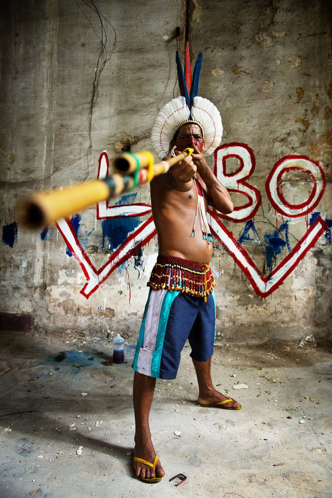 Indigenous community that was harshly forced from their homes, to make place for parking lots and shopping malls for the upcoming World Cup and Olympics. Their complex in Aldeia Maracanã, the old indigenous museum, is situated right next to the famous Maracanã stadium. After the protests in june 2013, the community got their living space back, although under special conditions. This portrait series was shot in January 2013. During this time the group was resisting to leave and was still submitting juridical letters. They received a lot of support from sympathisants from all over Brazil and later the issue caught the eye of the media from the rest of the world. To create an aversion, the Brazilian media described them repeatedly as a group of wild Indians who were fighting with blowguns and bows and arrows. The series shows that they didn't own any weapons to actually fight with.